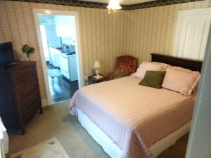The Galley Suite has two rooms, a bedroom, and a kitchen with a dining table, medium size frig, microwave, toaster oven, and cabinets/sink.