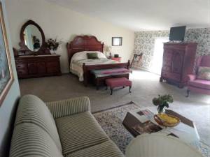 The spacious Stateroom Suite has a lounging area with two comfy chairs and a sofa.